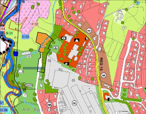Im Gegensatz zum Funktionsgebäude des Fußballplatzes entsteht auf einer ca. 3,00 m hohen Geländeauffüllung ein bis zu 10 m hohes Gebäude plus technisch erforderliche höhere Anlagen (z.B. Kamin). Dieses Gebäude entwickelt ebenso wie das oberhalb gelegene Werksgebäude eine erhebliche, ortsbildprägende Fernwirkung. Durch Festsetzungen zur Fassadengestaltung und Eingrünung muss diese Wirkung deutlich gemindert werden.