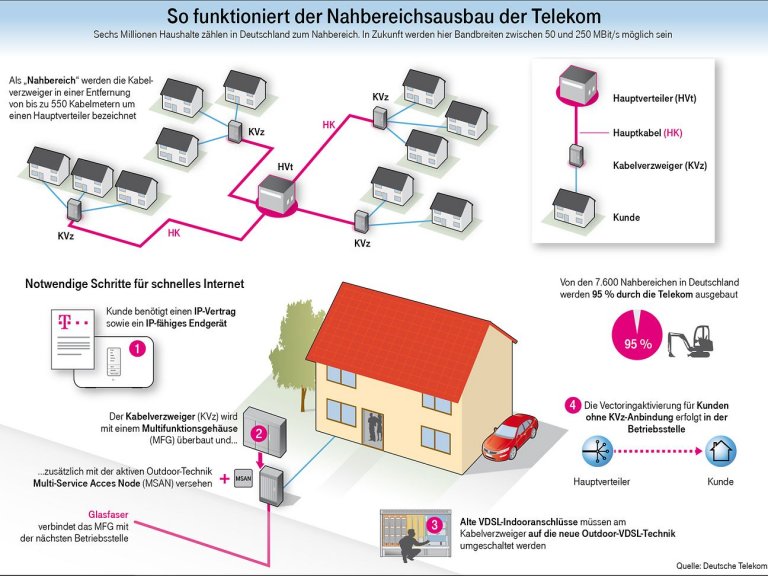 Die Telekom betreibt in Deutschland rund 7.500 Betriebsstellen. Das sind Knotenpunkte im Kommunikationsnetz, die früher als Vermittlungsstellen bekannt waren. An die Betriebsstellen sind die Kabelverzweiger und Multifunktionsgehäuse (MFG) angeschlossen. Das sind die grauen Kästen, von denen aus die Telekom ihre Festnetz-Kunden versorgt. Diese Nahbereiche durften in der Vergangenheit nicht mit Breitband ausgebaut werden. Diese wettbewerbsrechtliche Vorgabe hat die Bundesnetzagentur Mitte 2016 aufgehoben. Und seitdem ist die Telekom nicht nur berechtigt, sondern sogar verpflichtet, den Nahbereich auszubauen. Das so genannte Super Vectoring, eine besonders schnelle Glasfasertechnik, ermöglicht dabei Downloadgeschwindigkeiten von bis zu 250 Mbit/s.